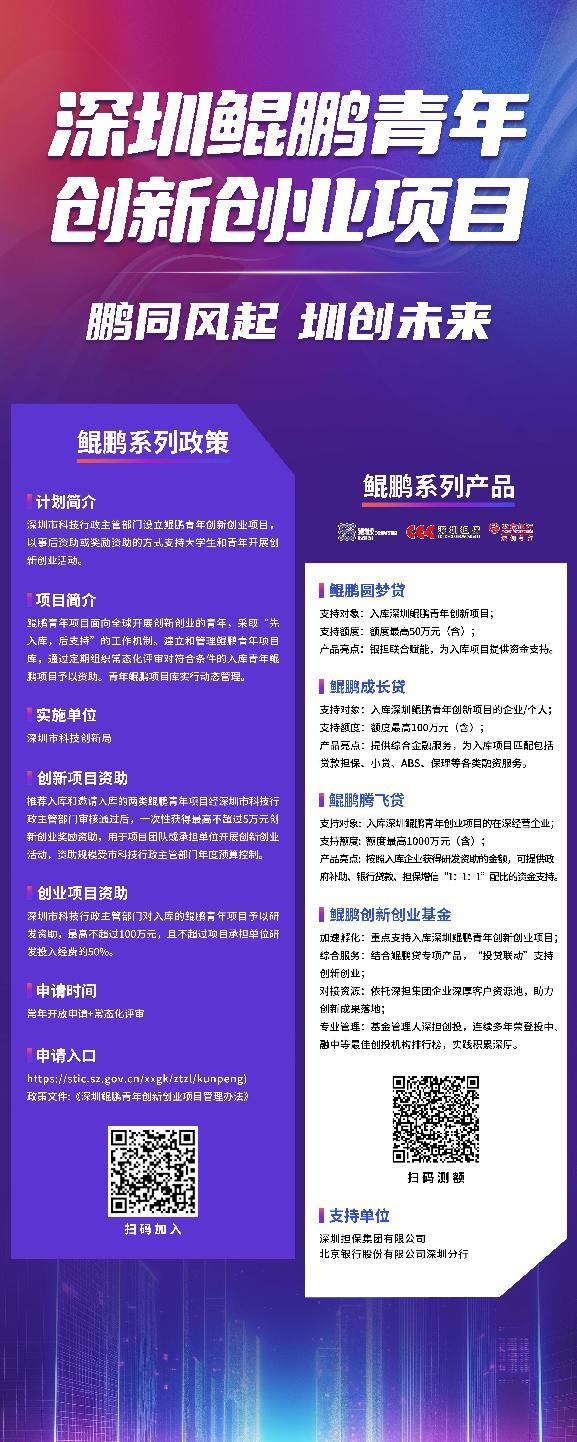 深圳鲲鹏青年创新创业项目面向全球青年长期开放入库,连续5年提供创业场地、资金等支持,市科创局对单个项目最高资助100万元。同时,深担集团基于多年服务中小企业所积累的经验和优势,为深圳鲲鹏青年量身定制的“3+1”投融资服务产品,包含了总规模10亿元的“鲲鹏圆梦贷”“鲲鹏成长贷”“鲲鹏腾飞贷”,以及拟设立总规模2亿元的鲲鹏创新创业基金,为入库人才及项目提供“投贷联动、接力陪伴”的全生命周期金融服务,精准滴灌毕业生的创新创业梦想,助力广大毕业生来深创业。