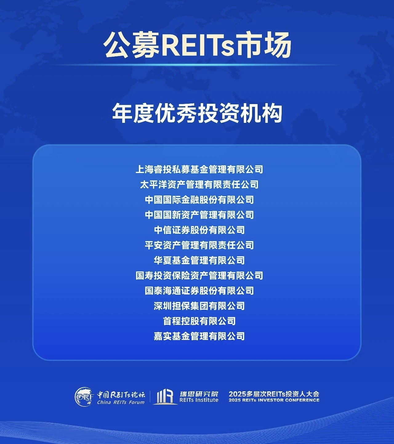 12月25日,“2025多层次REITs投资人大会”在北京举办。本次大会由瑞思不动产金融研究院主办,汇集了来自保险、券商、基金、国资平台、产业资本等领域的近300位机构代表与行业专家,深入探讨REITs市场的发展现状与未来趋势。在荣誉发布环节,深担集团凭借在公募REITs领域的专业布局与亮眼表现,与国内其他11家行业领先的优秀投资机构共同上榜“公募REITs市场年度优秀投资机构”。深担增信公司副总经理孙甡出席大会及颁奖仪式。