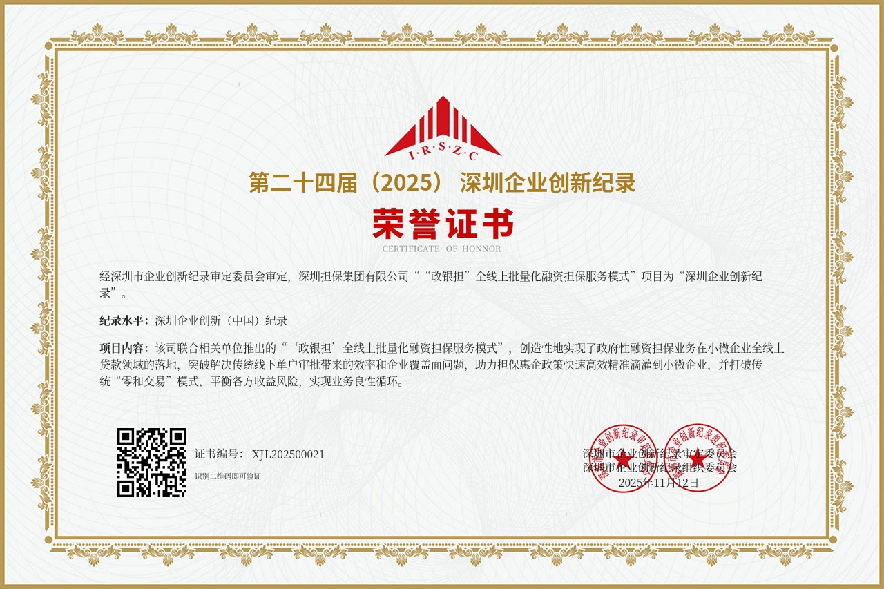 为破解中小微企业“融资难、融资贵”问题,深担集团联合微众银行、深圳市融资担保基金有限责任公司创新打造“政银担”全线上批量化融资担保模式,率先实现政府性融资担保业务在小微企业全线上贷款领域的落地,突破解决传统线下单户审批带来的效率和企业覆盖面问题,企业主仅用一部手机数分钟内即可完成从授信申请到最终贷款发放,以分钟级到账的效率满足企业的资金需求,助力担保惠企政策快速高效精准滴灌到小微企业。