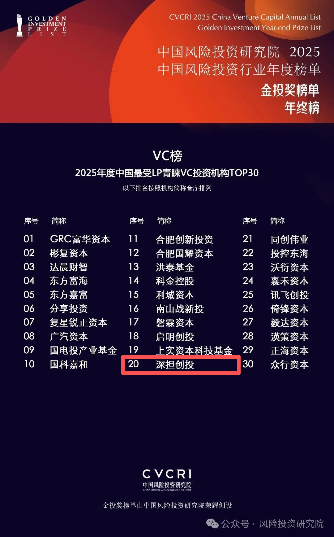近日,中国风险投资研究院正式揭晓“2025中国风险投资行业年度榜单·金投奖榜单·年终榜”。深担创投凭借在基金募资领域的优异表现,成功上榜“2025年度最受LP青睐VC投资机构TOP30”。